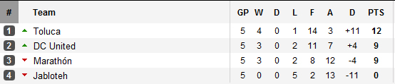 Sauf cataclysme lors de l’ultime journée, Toluca jouera les quarts de finale. Les mexicains comptent en effet 3 points d’avance sur le 3e Marathón, qui vient de créer la sensation de la 5e journée en infligeant au leader mexicain sa première défaite, mais la différence de buts leur offre une confortable avance (+11 pour Toluca, -4 pour Marathón). Le deuxième ticket pour les quarts se jouera donc être les honduriens et les américains de DC United, tous deux à égalité de point. DC se déplacera à Toluca lors de l’ultime journée, alors que Marathón ira sur la pelouse de Jabloteh, l’autre équipe à zéro point.