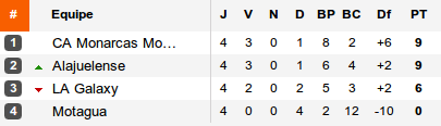 Première sensation de la semaine, la chute du Galaxy et ses stars devant les costaricains d'Alajuelense. La LDA en profite pour doubler les américains au classement et fait l'affaire des Monarcas qui, totalement relancés, s'imposent à Motagua et prennent la tête d'un groupe qui pourrait voir le Galaxy éliminé en cas de défaite la semaine prochaine à LA face à Morelia.