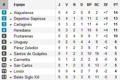 LDA, Saprissa, Cartaginès et Herediano, les quatre gros bras du championnat semblent décidés à ne pas laisser de lumières aux autres. La LDA et la S restent encore invaincus après 6 matchs avant de se retrouver le week-end prochain. Derrière, Cartaginès suit à trois points, accompagné par Herediano. Seul absent, le dernier finaliste Santos de Guápiles qui a attendu le week-end dernier pour ouvrir son compteur victoire en atomisant San Carlos.