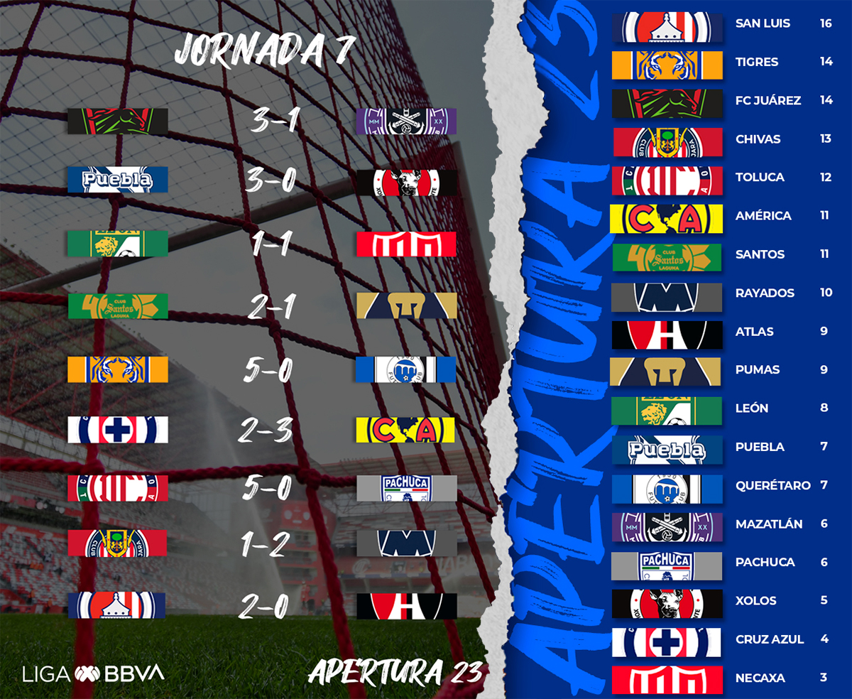 L’autre information à retenir de la journée, c’est bien évidemment le leader San Luis qui a gardé sa première place. Les hommes de Gustavo Leal l’ont emporté à domicile contre l’Atlas (2-0), enchaînant un cinquième succès de rang en championnat. Son dauphin des Tigres a lui déroulé avec une très large victoire face à Querétaro (5-0) pour grimper sur le podium. André-Pierre Gignac en a profité pour inscrire sur penalty son troisième but du tournoi. Dernière équipe complétant le podium, le FC Juárez continue d’impressionner avec une victoire contre Mazatlán (3-1). Arrivé de Talleres (Argentine), le Colombien Diego Valoyes a ébloui l’Estadio Benito Juárez pour son premier match de Liga MX avec un golazo et deux passes décisives.