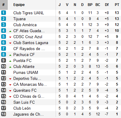 Dans les autres rencontres, Pachuca, le nouveau club de Fernando Cavenaghi, s’impose à domicile devant le dernier finaliste Toluca toujours à la peine (5 points en 5 matchs), Chivas attend encore un premier succès après le nul concédé à domicile devant San Luis tout comme León accroché chez lui par Cruz Azul. Monterrey quant à lui se fait surprendre par Atlante : malgré une possession de 62%, les Rayados n’ont réussi à tirer au but qu’à deux reprises avant de perdre lourdement à Cancún.