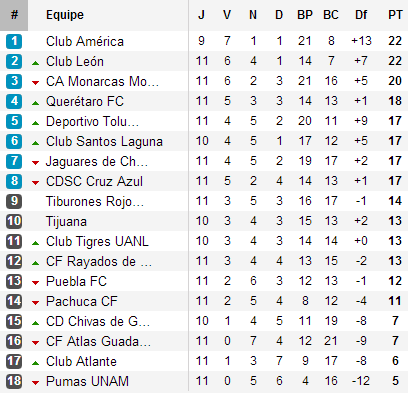 Suivent ensuite Morelia et Querétaro, tous deux défaits lors de la 11e journée et qui voient revenir sur eux un Deportivo Toluca impressionnant. Les Diables Rouges atomisent Querétaro (4-0) et se replacent à cinq points du leader.