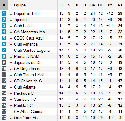 Le duel Toluca – Tijuana se poursuit et la quatorzième journée aura permis aux Diablos Rojos de revenir sur les Xolos. Pour cela, Toluca compte sur l’appui de Cruz Azul qui va obtenir un bon nul à Tijuana et écrase un Santos Laguna en pleine dérive (3 matchs sans victoire) dont la place en Liguilla est de plus en plus menacée. Conséquence, Toluca reprend la tête au classement à égalité de point avec son concurrent direct.