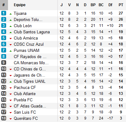 Car derrière, la 12e journée aura été marquée par l’incapacité des leaders à s’imposer. León est accroché à Pachuca, Santos par la lanterne rouge Querétaro, Cruz Azul par Atlas alors qu’América tombe chez lui lors du Súper Clásico que tout le Mexique attendait. Cela fait désormais 3 ans que les Águilas n’ont plus battu Chivas à domicile. Autre leader défait, Monterrey s’incline sur le terrain des Pumas.