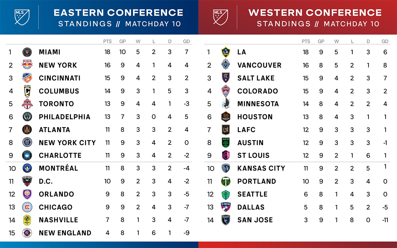 Dans les autres rencontres de cette journée, Columbus et Portland se sont quittés sur un match nul, NYCFC prend le dessus sur DC United, Toronto s’impose par la plus petite des marges sur New England qui s’enfonce dans la crise juste avant de recevoir l’Inter Miami devant plus de 60000 spectateurs, ce qui fera certainement drôle aux joueurs du Massachusetts. Montréal et Orlando n’arrivent pas à se départager. L’Inter Miami fait tomber Nashville dans une rencontre qui en deviendrait presque un classique. Salt Lake City ne fait pas dans le détail face à Chicago et s’impose 4-0 au Soldier Field. Kansas City et St.Louis se quittent sur un match nul, Austin arrache la victoire face à Houston, Colorado prend le dessus sur Dallas. Enfin, Vancouver s’imposait face à Seattle dans ce derby du Pacifique Nord alors que le LAFC ne parvient pas à prendre le dessus sur New York Red Bulls et que Minnesota s’impose face à Charlotte.