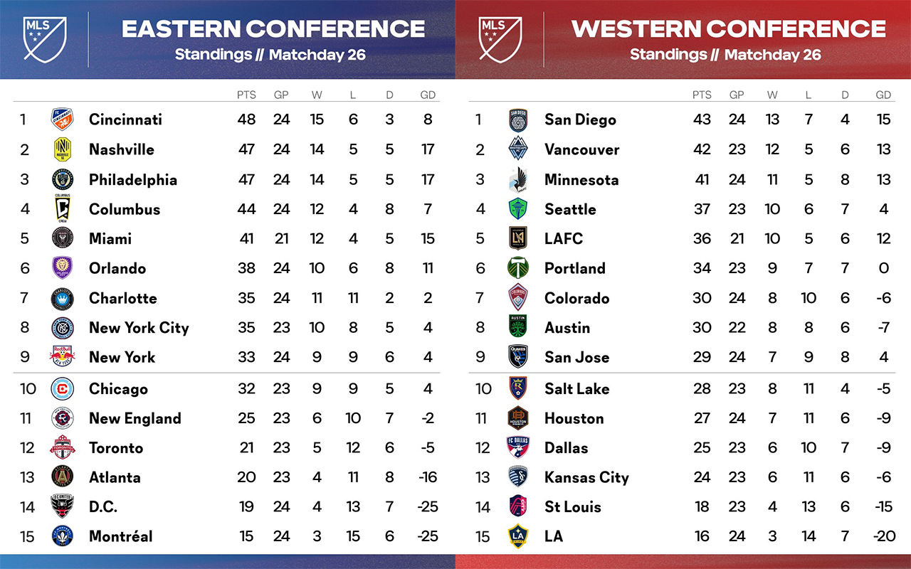 Dans la conférence Ouest, San Diego et Vancouver se disputaient la première place du classement. Mais la rencontre au Snapdragon Stadium a accouché d’un score nul (1-1) qui permet aux locaux de garder leur place sur le trône d’un tout petit point. Tenu en échec dans les derniers instants à Portland (1-1), Minnesota n’en profite pas pour passer en seconde position.