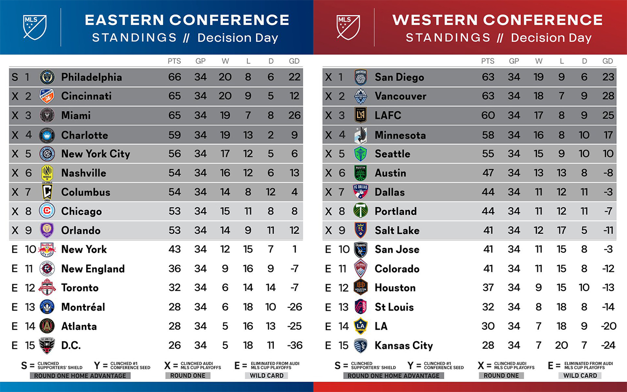 La conférence Ouest était la seule a devoir décerner ses deux dernières places pour la post-saison. Dans un match pas si simple à négocier à Vancouver, Dallas a rempli sa mission en s’imposant (2-1) malgré une belle résistance des Whitecaps à dix contre onze pendant quatre-vingts minutes. Après avoir manqué les play-offs l’an dernier, Los Toros y retournent et surtout sans passer par la case play-in. Car au même moment, lourdement défait chez lui par San Diego (0-4), Portland abandonne sa septième place à Dallas, qui n’en demandait pas tant. Un succès pour la nouvelle franchise qui lui permet de remporter la conférence et doubler ainsi les Whitecaps sur le fil. Les Timbers ratent leur final, comme l’an passé et se retrouvent donc à devoir passer par la case barrage. Ils y croiseront le Real Salk Lake, qui aura joué à se faire peur. Les Claret and Colbalt menaient de deux buts à St.Louis après la demi-heure de jeu mais se sont fait reprendre en toute fin de rencontre. Heureusement pour eux, le troisième but n’est jamais arrivé, qui aurait été synonyme de vacances à Cancún. En effet, Colorado, revenu en fin de match face au LAFC (2-2) et San Jose, victorieux d’Austin (2-1), frappaient durement à la porte. Finalement, Salt Lake défiera Portland grâce à son plus grand nombre de victoires cette année (douze contre onze).
