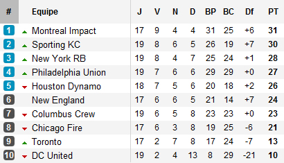 Un trou d’air. Longtemps irrésistible, l’Impact vit une période délicate, symbolisée par ses multiples faillites défensives. Après la spectaculaire défaite 4-3 à domicile devant Colorado et le nul péniblement arraché à Toronto, Montreal se voit encore contraint se partager les points avec un Chivas qui n’a pourtant rien d’un premier du rang. Avec cette mauvaise série, l’Impact gâche encore une occasion de prendre le large au classement et voit le Sporting Kansas se rapprocher. Seule équipe à s’imposer à l’extérieur lors des matchs du week-end, Kansas profite ainsi de la défaite du New York, privé désormais de Juninho rentré au Brésil pour incompatibilité d’humeur avec son coach, et de Philadelphie, battu par un Houston qui n’a pas encore dit son dernier mot. La conférence Est voit donc l’Impact toujours en tête, avec à un tout petit point le Sporting Kansas entraînant dans sa roue six équipes qui sont encore dans le coup pour la qualification.