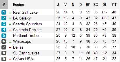 A l’Ouest, outre le spectaculaire mais tout aussi inutile doublé d’Erick Torres qui offre un point à Chivas, seule équipe larguée dans la conférence, face à Vancouver, le week-end était celui du choc entre Real Salt Lake et Portland. 60% de possession de balle, 529 passes (453 courtes) et une série moyenne de 6 passes par mouvement offensif, la démonstration collective laissée par les Royals devrait avoir marqué les esprits. Grande interrogation d’avant-saison, le Real Salt Lake n’a cessé de monter en puissance pour offrir un festival face à des Timbers totalement dépassés par la fluidité symbolisé par l’extraordinaire mouvement à l’origine du but de Luis Gil. Score final 4-2 pour la meilleure formation de la ligue qui n’aura eu droit qu’à 3 diffusions nationales cette saison (parmi les 87 rencontres diffusées aux USA quand, par exemple les Red Bulls auront été diffusés 19 fois). Une hérésie. Notons enfin que dans cette conférence, la première place de Salt Lake reste bien précaire : avec ses trois succès consécutifs, le Galaxy, qui compte deux matchs de retard n’est qu’à cinq points alors que les Sounders, et leurs quatre matchs de retard, ne sont finalement qu’à huit points et restent sur une série de quatre victoires lors des cinq derniers matchs.