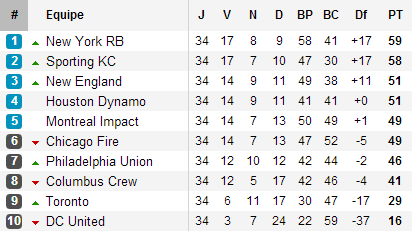 Le point chaud du week-end concernait la conférence Est. D’un côté, New York et Kansas City se disputaient à distance la place de meilleure équipe de la phase régulière, de l’autre, Montréal, Chicago, New England et Houston luttaient pour une place en play-offs. Il y aura donc forcément eu un grand perdant ce celui-ci sera Chicago. Opposés aux Red Bulls, les Fire y auront cru l’espace de 20 minutes. Le temps pour Magee de signer son 21e but de la saison et le temps pour Thierry Henry d’envoyer une merveille de demi-volée pour ramener New York. Au retour des vestiaires, Chicago craque et finit par s’incliner 5-2, voyant ses rêves de play-offs s’envoler. Car pendant ce temps, Houston s’est imposé à DC (désormais pire équipe de l’histoire de la MLS) et New England à Columbus. Conséquence, Revs et Dynamos doublent les Fire, chassant ceux-ci du top 6. Le soulagement est pour Montréal. L’Impact sauve d’un cheveu sa place en play-offs en tombant à Toronto, signant une sixième défaite sur les 8 derniers matchs !