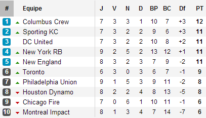 A l’Est, la semaine 8 n’aura pas été des plus prolifiques pour les leaders. Columbus est accroché chez lui par New York et son buteur du moment Bradley Wright-Phillips (oui, le fils de ou le frère de si vous préférez), auteur de 4 buts ce week-end (1 à Columbus, 3 lors du carton des Red Bulls à domicile face à Houston 4-0). Ce nul suffit pourtant au bonheur du Crew qui profite de la défaite du Sporting à New England. Mauvaise semaine pour le SKC, symbolisée par l’exclusion d’Aurélien Collin à l’entrée du dernier quart d’heure suivie de deux buts encaissés dans les derniers instants du match. Reste enfin à signaler la première victoire de la saison de l’Impact chez lui face à Philadelphie. Si le court succès décroché est encore loin de rassurer les fans de l’Impact, il leur permet cependant d’enfin croire au lancement de la saison. Reste à le prouver lors du prochain match dans quinze jours face au champion sortant.