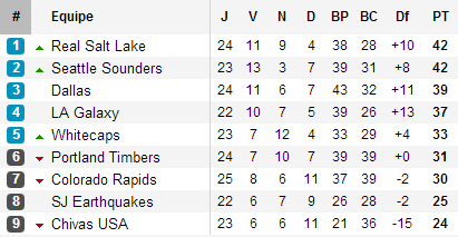 Car outre le Real Salt Lake, nouveau leader, plusieurs autres outsiders se rapprochent. Dallas, la meilleure attaque de la ligue et ses trois victoires consécutives (la dernière en feu d’artifice à San José (5-0 avec un triplé du rookie Tesho Akindele)) n’est plus qu’à trois points alors que le Galaxy, sorti vainqueur du match le plus spectaculaire de la semaine à Colorado (victoire 4-3 après avoir été mené 3-1) est en train de revenir comme un boulet et peut encore venir dépasser tout le monde avec ses deux matchs de retard. Avec un déplacement à Dallas et un « back-to-back » ave Seattle pour finir la saison, Los Angeles semble maître de son destin. Une certitude, Seattle, Salt Lake, Dallas et LA joueront la qualification directe dans la conférence alors que la dernière place pour les play-offs devrait se jouer entre Vancouver, Portland et Colorado.