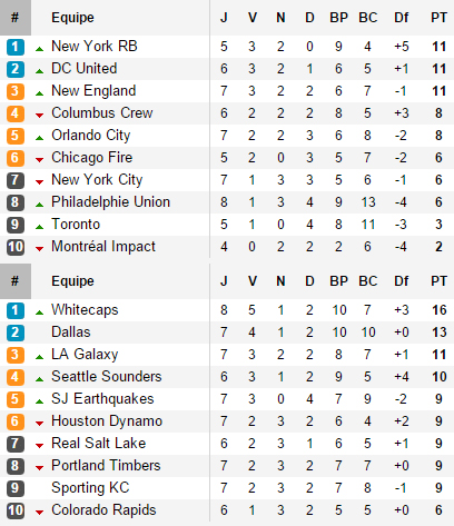 A l’Ouest, après avoir laissé des points lors des deux derniers matchs, les Whitecaps reprennent leur marche en avant en allant faite tomber pour la première fois de la saison un Real Salt Lake qui a terminé la partie à neuf contre onze. La chute des Royals couplée à celle de San José et au nul de Houston permet à deux grosses cylindrées de se rapprocher. Los Angeles s’en remet à un but de Gonzalez dans les ultimes secondes pour s’imposer face au Sporting Kansas alors que Seattle écrase les Rapids chez eux. Les deux grands favoris de la conférence sont désormais dans le top 6.