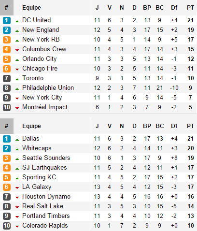 Si l’Est semble dominé par un futur trio, l’Ouest est bien plus ouvert, peuplé d’équipes qui trustent les premières places du classement combiné des deux conférences (le sixième à l’Ouest, Los Angeles, compte autant de points que les Red Bulls, troisièmes à l’Est). Dallas et les Whitecaps tentent tant bien que mal de résister en tête mais voient revenir sur leurs pas le Seattle de Dempsey, tombeur de Vancouver la semaine passée et qui, avec un match de retard sur Dallas est aujourd’hui leader virtuel de la conférence à l’heure d’accueillir le Sporting Kansas, membre du trio des équipes à 17 points.