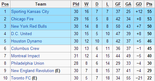 A l’Est, la situation reste très indécise. Le Sporting Kansas et Chicago devraient être les premiers qualifiés la semaine prochaine mais derrière, ils sont quatre pour trois places. DC United profite du nul de New York à New England (avec deux buts inscrits dans les arrêts de jeu) pour revenir sur les Red Bulls (qui conservent la troisième place grâce à leur attaque) alors que Houston et Columbus ratent l’opportunité de se rapprocher encore plus. Les Dynamos coulent à Philadelphie pendant que le Crew tombe à Chicago. 5 points séparent ces quatre équipes.