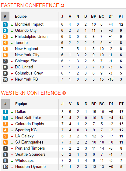 Deuxième rendez-vous pour Dallas, la réception de l’ancien leader Sporting Kansas, tout juste tombé face aux Rapids. Là encore, les Texans n’ont pas eu la possession, n’ont pas eu les occasions mais sont sortis vainqueurs du duel. Un but de Barrios, une merveille de coup franc de Mauro Rosales et le SKC tombe une deuxième fois consécutive, laissant Dallas seul leader commencer à creuser des écarts. Seul le Real Salt Lake, vainqueur des Whitecaps sur un but d’el Burrito Martinez, parvient à s’accrocher au prix de trois victoires consécutives.