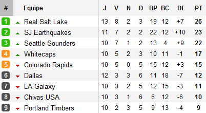 A l’Ouest, l’affiche du week-end opposait le Real Salt Lake et les Sounders pour le second match de la semaine de chacune des deux équipes. Après avoir disposé de Dallas au Dallas Stadium sur un doublé du toujours excellent Fredy Montero, Seattle est tombé chez lui sur une pépite signée Fabian Espíndola. Avec ce succès, les Royals restent leaders, comptant trois points d’avance sur San José, qui dispose de deux matchs pour revenir à hauteur, quatre sur des Sounders qui comptent trois matchs de retard. Reste qu’avec 26 points, Salt Lake est leader de la ligue et compte 15 points d’avance sur le champion sortant, Los Angeles, sauvé par David Bekcham au Stade Olympique de Montréal.