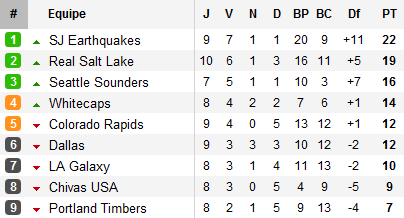 A quoi reconnaît-on un leader de MLS cette semaine ? A sa capacité à ne jamais rendre les armes. San José et Salt Lake, leaders de l’Ouest, semblaient contraints de devoir se contenter d’un résultat nul face à respectivement Philadelphie et Toronto. Mais une dernière poussée offrait à chacun une précieuse victoire dans les ultimes secondes leur permettant de conserver leur place en tête de la conférence Ouest. Il fallait bien cela puisque derrière, les Sounders en s’imposant à Chicago, reste à portée de tir, encore plus après leur succès de la nuit dernière face à Los Angeles dont le début de saison reste poussif (le Galaxy avait également attendu les arrêts de jeu pour sauver un point face à Dallas au Home Depot Center). Conséquence, l’Ouest reste dominé par San José (qui s’est imposé ce mercredi devant DC United) suivi de Salt Lake à trois points (mais avec un match de plus joué) et Seattle à six points (avec deux matchs de retard). Derrière eux, les Whitecaps s’accrochent après leur succès à Columbus grâce à un superbe coup-franc de l’ancien Spurs Lee Young-Pyo.