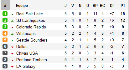 A l’Ouest, le Real Salt Lake s’affirme comme le patron de la conférence mais reste sous la menace des Earthquakes, emmenés par leur sérial buteur Chris Wondolowski qui fait plier à lui seul pour la première fois de la saison, les Whitecaps qui avaient pourtant ouvert le score par Sébastien Le Toux. Le double choc Sporting Kansas - Real Salt Lake et New York – San José du week-end prochain s’annonce d’ores et déjà comme le premier grand évènement de ce début de saison.