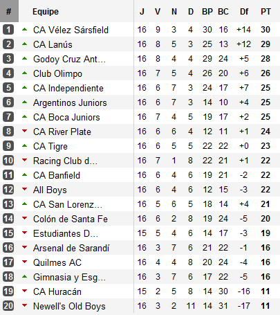 Multiples car dans la lutte pour le maintien, ce succès de Tigre fait des dégâts. Premier concerné, River. En déplacement à Bahía Blanca pour y défier Olimpo, les Millonarios sont surtout apparu crispés. Incapable de développer leur jeu, les hommes de Juan José Lopez accrochent un nul qui les maintient en position de barragiste. Pendant ce temps, Independiente, vainqueur d’Estudiantes, a quasiment assuré son maintien alors qu’All Boys ne devrait avoir besoin que de deux points en trois matchs pour en faire de même. Conséquence, River lutte désormais avec 3 équipes : Tigre qui profite du week-end pour prendre 3 points d’avance, Arsenal (1 point devant) et son hôte du jour Olimpo. Pour éviter les barrages, River devra quasiment réaliser un sans-faute avec un calendrier plus que défavorable : outre la réception de Colón, River se déplacera à La Plata pour y défierun Estudiantes qui vient de remercier Eduardo Berizzo, avant de conclure par Lanús qui pourrait alors jouer le titre. La dix-septième journée s’annonce décisive pour River qui devra absolument s’imposer pendant qu’Arsenal et Olimpo s’affronteront.