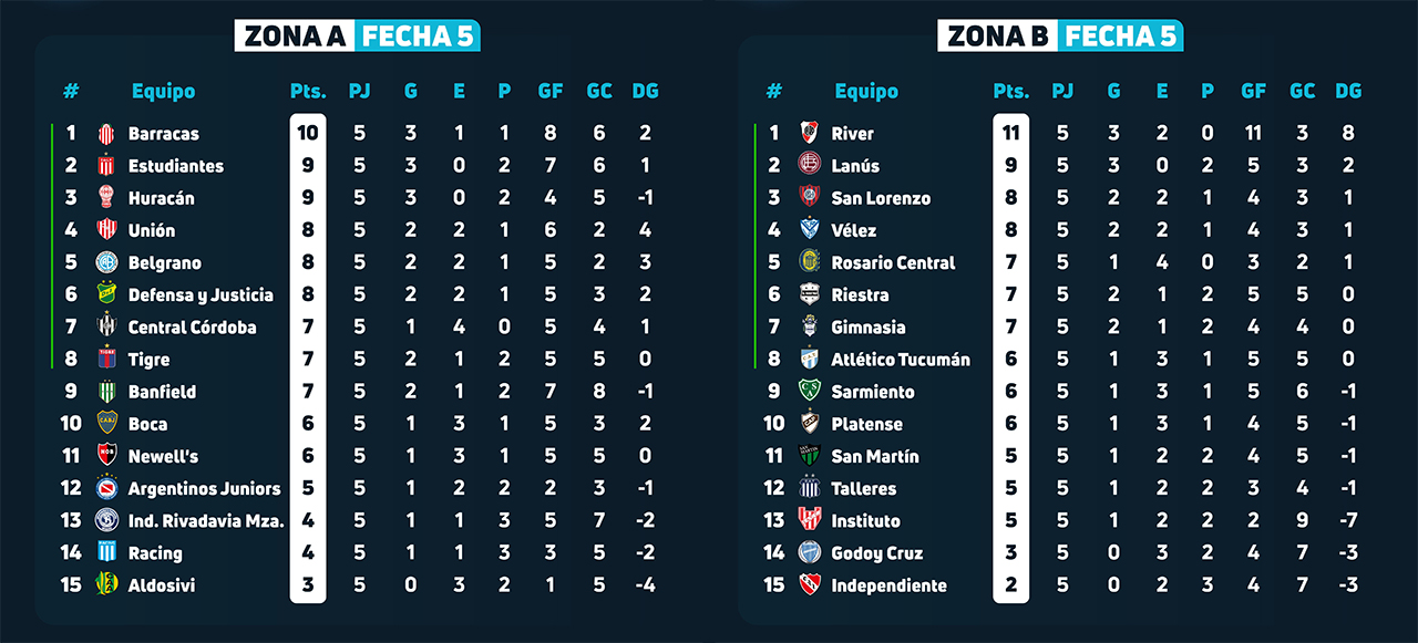 La lutte à la table annuelle s’annonce totalement folle. Elle est pour l’instant dominée par River, qui semble retrouver son identité Gallardo lors de certains matchs, mais connait parfois quelques ratés, sur une mi-temps ou sur un match entier, devant également gérer son calendrier et ses ambitions en Libertadores. River fait partie des trois invaincus après cinq journées, avec deux Central, deux spécialistes des résultats nuls : le Rosario Central d’Ángel Di María et Central Córdoba qui continue de bousculer la hiérarchie même si encore largement concerné par la lutte pour le maintien, le Ferroviario semblant tout de même hors de portée du trio Sarmiento – Aldosivi – San Martín qui devrait se battre pour éviter la place dans la charrette, les deux derniers luttant à la fois à la table annuelle mais aussi aux promedios.