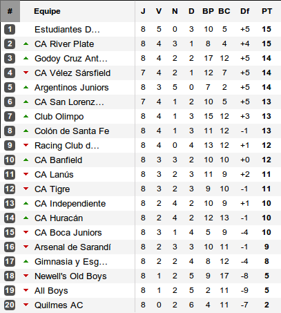 Le championnat argentin se resserre : après 8 journées, 10 équipes se tiennent en 3 points, 15 en 5 points ! Difficile dans ces condition de se livrer à quelque pronostics mais la huitième journée aura été celle des grands retour.
