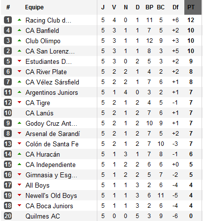 Cette victoire offre le leadership au Racing qui profite d’un week-end fatal aux deux autres leaders. Estudiantes est surpris chez lui par l’imprévisible Godoy Cruz (0-1) alors que River, à l’image de l’énorme bourde de son portier Leandro Chichizola, s’automutile chez lui et laisse briller l’inévitable Santiago Silva, auteur du doublé de la victoire de Vélez, synonyme de première défaite de la saison pour River. Conséquence, les poursuivants se rapprochent et le classement se resserre.