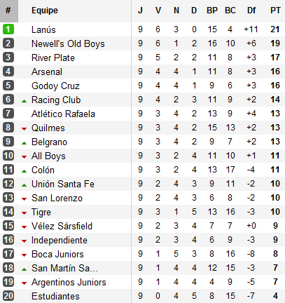 Loin de ces préoccupations, les leaders Lanús et Newell’s ont profité de la semaine pour prendre une légère avance. Le Granate arrache la victoire dans les derniers instants face à All Boys et conserve ainsi ses deux points d’avance sur la Lepra sortie victorieuse de Tigre. Les deux leaders profitent ainsi du nul entre leurs deux poursuivants River et Arsenal et de celui de Godoy concédé à La Plata face à Estudiantes, la lanterne rouge du tournoi.