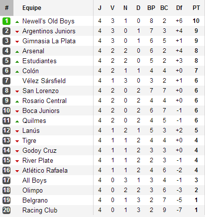 Argentinos se rapproche donc du maintien mais se place aussi dans la roue de Newell’s pour l’Inicial 2013. Derrière lui, le Gimnasia est talonné par le duo Arsenal – Estudiantes, suivi tout près par Colón, auteur du hold-up parfait au Monumental. Car l’autre information est là : des prétendants annoncés, seul Newell’s assume son statut. Lanús, qui n’a qu’une seule victoire au compteur, et River, qui a déjà concédé deux défaites, sont déjà à cinq et six points du leader alors que Boca, toujours aussi peu convaincant, San Lorenzo moins régulier que prévu et Vélez, spécialiste des matchs nuls, sont également en retard en milieu de tableau.