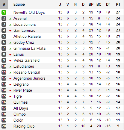 Désormais totalement hors course pour le titre (11 points à remonter en 6 journées), River observe donc de loin son meilleur ennemi profiter de la 13e journée pour signer la belle affaire. Newell’s accroché par Godoy Cruz, Arsenal par le Gimnasia et San Lorenzo tombé face au Granate, les Xeneizes s’imposent tranquillement face à Colon et reviennent ainsi à 3 points du leader, doublant ainsi le Ciclon chez qui ils se rendront ce dimanche pour ce qui sera l’affiche de la journée. Avec les nuls en ouverture de la 14e journée entre Arsenal et All Boys et Colon et Newells (voir bonus en fin d'article), ce choc au sommet s'annonce bouillant.