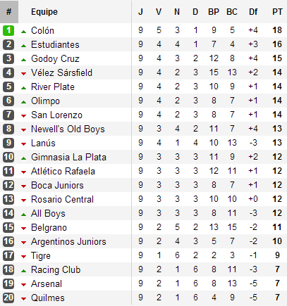 Dans sa roue, Estudiantes est passé tout proche d’une belle affaire. Menant au score à Amalfitani, les Pinchas se font rejoindre en fin de rencontre par un Fortin présent sur deux tableaux mais doublé par le Tomba. Godoy Cruz, qui joue également sa survie, réalise également un superbe parcours, présentant, après sa victoire du week-end face à Arsenal (2-1, doublé d’Óbolo), le troisième meilleur bilan après neuf journées. Conséquence, le Tomba n’est plus qu’à trois points de l’Albo, premier non relégable. C’est dire si la mission d’Argentinos se complique, le Bicho, dernier au Promedio, se retrouvant désormais à huit points du maintien.