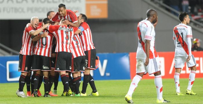Est-ce l’usure physique ou mentale provoquée par des semaines de joutes continentale ? La question sera forcément posée. Pourtant, en déplacement à La Plata, River a d’abord paru contrôler la partie. Avec une formation encore remaniée et un 4-4-2 losange avec Kranevitter seul cinqo, Lucho en meneur de jeu avec el Pity et Driussi sur les côtés pour alimenter le duo Alario – Viudez, River allait ouvrir le score sur une merveille de l’ancien marseillais qui venait ainsi éclairer un premier acte somme toute assez terne. Dès le retour des vestiaires, les hommes de Gallardo auraient pu/dû tuer le match, El Pity Martínez, seul à deux mètres du but trouvant le moyen de rater le cadre dès la 40ème seconde. Et au moment où River contrôlait, Estudiantes, dans la plus pure tradition pincha, allait revenir, Mendoza envoyant un zurdazo dans la lucarne d’un Barovero scotché, conclusion d’un joli mouvement collectif. On ne le savait pas encore mais le match avait tourné. Car dix minutes plus tard, les Pinchas qui avaient enfin commencé à jouer dans le camp rival, doublaient la mise par Sebastián Domínguez. Faute de n’avoir su tuer le match, River se montrait sans solution pour aller chercher à le sauver. Conséquence, les Millonarios sont désormais relégués à neuf points des leaders.