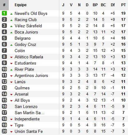 A l’exception de Newell’s et sa défense hermétique qui est resté hermétique pour la septième fois en neuf matchs (!), tous ont encaissé au moins un but le week-end dernier. Vélez est humilié chez lui par Colón (2-4 avec un doublé d’Emmanuel Gigliotti), Belgrano sauve le nul à Quilmes de même que Boca, accroché chez lui par San Martin qui a pourtant joué 50 minutes en infériorité numérique. La belle affaire, elle est donc pour le Racing.