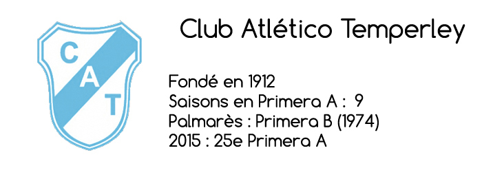 Promu l’an dernier, Temperley n’a dû son maintien qu’à une parodie de match lors de la dernière journée qui lui a assuré le point nécessaire (3 tirs en 90 minutes – lire Argentine - Primera Division 2015 : ce n'est qu'un début), et devrait encore bagarrer pour sa survie en 2016. Pour cela, le Gasolero ne bouleverse pas son groupe mais lui adjoint néanmoins trois recrues intéressantes : le local Matías Sánchez, l’ancien international u17 Alexis Zárate et la machine à but Rubén Ramírez. Autre changement de taille : Ricardo Rezza, l’homme de la montée et du maintien a quitté son poste, il est remplacé par Iván Delfino, l’homme qui a fait monter Patronato en Primera Division.