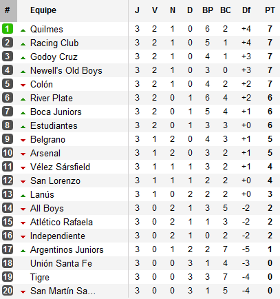 Derrière ces cinq équipes, River et Boca se retrouvent ensemble après le succès des Xeneizes devant All Boys, accompagné par Estudiantes qui coule San Lorenzo. Le Ciclón, qui lutte pour sa survie, se retrouve en position de relégable avant de se déplacer au Monumental le week-end prochain.