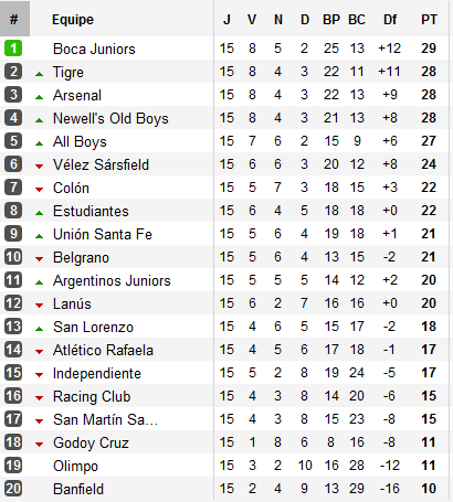 Car s’il est une certitude, c’est que la tension sportive est de retour sur les terrains argentins, le Clausura étant absolument passionnant. Tout a commencé avec le choc Tigre – Newell’s largement dominé par le Matador avec notamment un triplé de Carlos Luna qui prenait ainsi la tête du Clausura. Dans la foulée, All Boys arrachait un court succès chez lui devant San Martin et restait au contact, à un point du leader provisoire. Vélez, sans doute tourné vers sa demi-finale retour de Libertadores, craquait chez lui devant Andrés Silvera et Belgrano. Les regards se tournaient donc vers Boca et Arsenal. En déplacement à Avellaneda, Boca n’a pas tremblé : une pépite de Viatri, un but signé Blandi et les hommes de Falcioni reprennent leur première place avant qu’Arsenal ne domine Lanús en clôture de la 15e journée. Bilan : Boca mène devant un trio à un point composé d’Arsenal, de Tigre et de Newell’s, deux points devant All Boys. Cinq équipes en deux points, le final sera énorme.