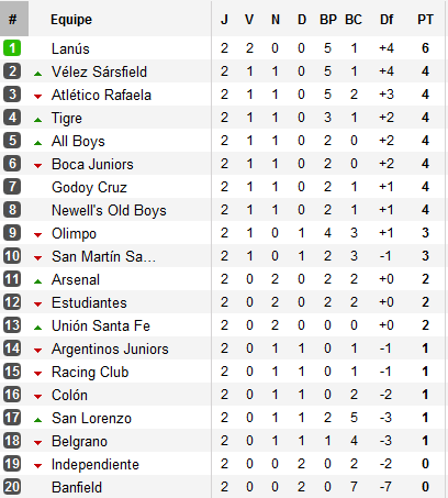 Loin de la tourmente, le Granate et le Fortín impressionnent. Lanús se trouve un buteur avec l’ancien millonario Mariano Pavone (3 buts en 2 rencontres) et s’impose sur le terrain d’Independiente, alors que Vélez et Obolo (3 buts en 3 matchs toutes compétitions confondues) atomisent une bien triste Banfield qui pourrait se retrouver rapidement à lutter pour sa survie.
