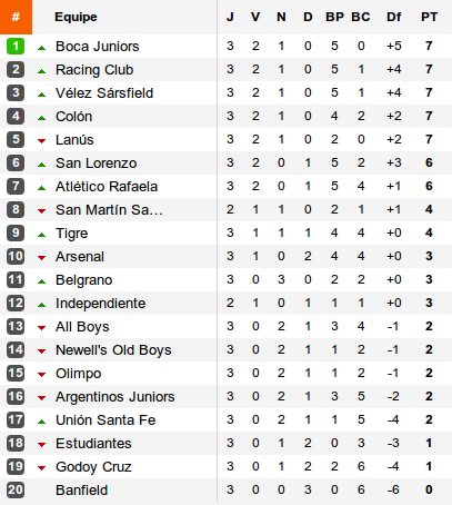 Finalement,un seul favori manque à l'appel : Estudiantes. Battu à Independiente, les Pinchas restent collés au fond du classement avec leurs deux défaites en trois rencontres. Il occupent la 18e place avec une autre déception : Godoy Cruz.