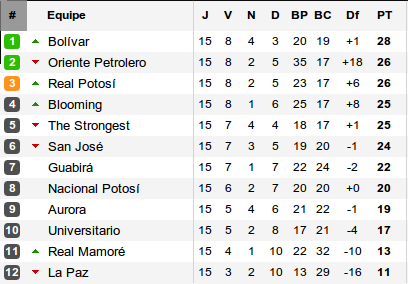 Si Oriente Petrolero a réussi à sauver l'honneur en libertadores (voir par exemple la victoire devant Grêmio), les semaines se suivent et se ressemblent en championnat. Battu chez lui par Blooming, les Verdolagas enchaînent un cinquième match sans victoire et cèdent désormais la place de leader à Bolivar. Le club le plus titré en championnat profite en effet de ce revers pour s'imposer chez lui devant San José (après avoir été mené 2-0) et prendre deux points d'avance.
