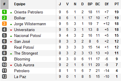 Premier d’entre eux, le leader virtuel Bolivar. Accroché chez lui par Universitario, quatrième à un point, la Academia profite de son premier match de retard pour s’imposer à Aurora et revenir à hauteur du leader. Aurora conclut ainsi une bien mauvaise semaine après avoir été balayé lors du súperclásico cochabambino face à Wilstermann. L’Aviador pousse Aurora à la crise de nerf en menant 4-0 à la pause avant de faire expulser deux joueurs supplémentaires en seconde période. Victoire finale 6-0 qui offre la troisième place à Jorge Wilstermann à un point du leader que l’Aviador accueille ce week-end.