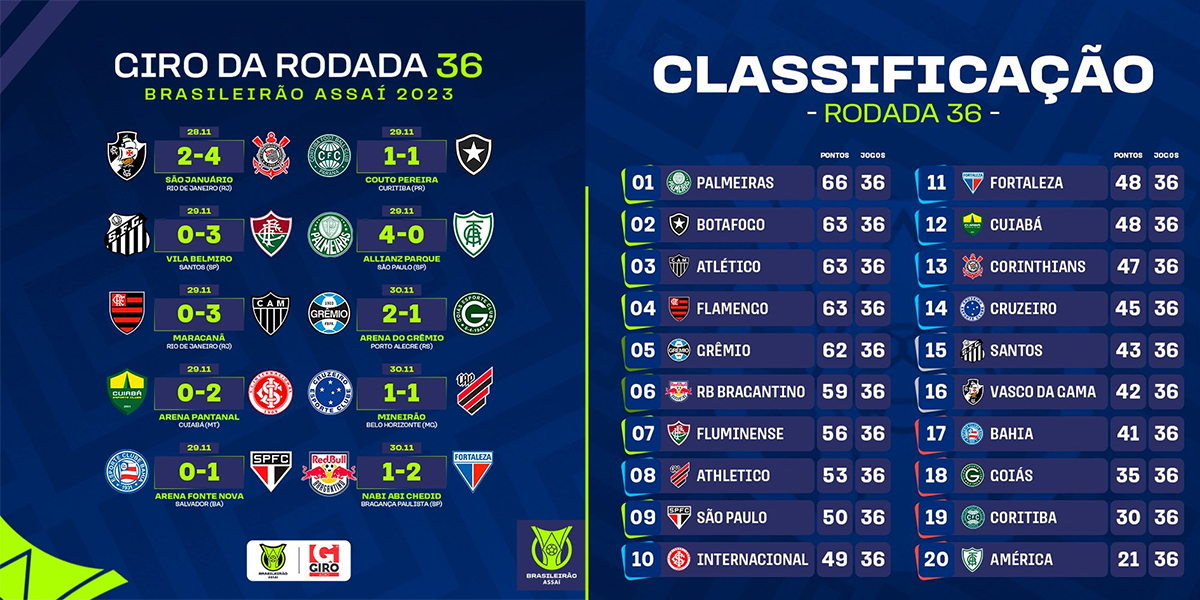 Fluminense, déjà qualifié pour la Libertadores grâce à son premier titre dans cette même compétition cette année, continue de dérouler et dispose facilement de Coritiba puis Santos. Le Tricolor est suivi par l’Athletico Parananense, qui enchaîne de son côté les matchs nuls, déjà le quatrième consécutif. La fin de saison s’annonce tranquille pour l’Internacional, Fortaleza, qui devient le premier club du Nordeste à jouer six saisons consécutives dans le Brasileirão depuis le passage au format européen en 2003, et Cuiabá, qui va pour sa part connaître une quatrième saison dans l’élite et n’a encore jamais connu de relégation. Autre club candidat à une qualification en Copa Sudamericana, le Corinthians, qui s’impose 4-2 sur le terrain de Vasco.