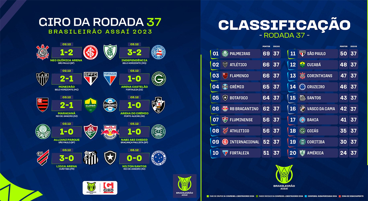 Si le titre est (quasiment) déjà joué et les représentants pour la Copa Libertadores sont connus, la dernière journée, dans la nuit de mercredi à jeudi à 1h30, offrira donc un affrontement à distance pour le maintien, où tous les candidats joueront à domicile : Vasco – Red Bull Bragantino, Santos – Fortaleza et Bahia – Atlético Mineiro.