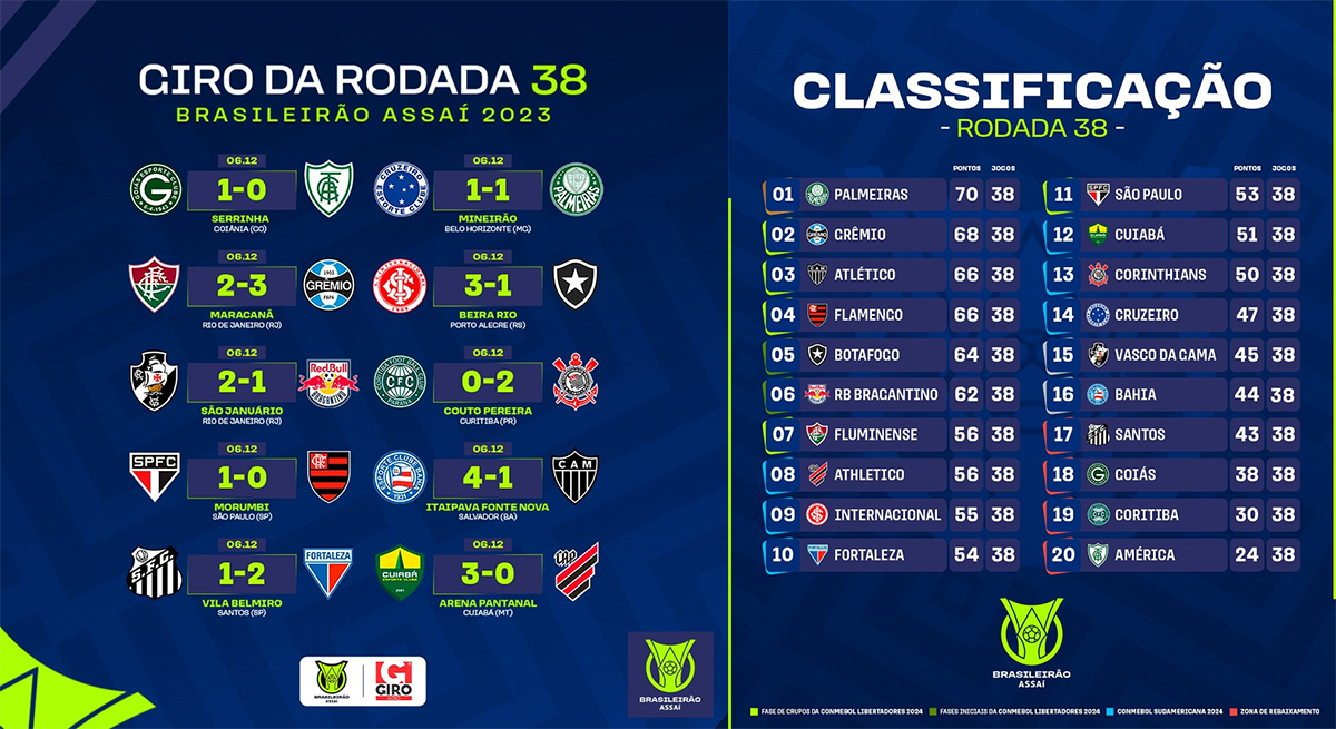 Déjà vainqueur du Brasileirão 2022, Palmeiras conserve son titre en 2023 alors que Santos est relégué pour la première fois de son histoire.