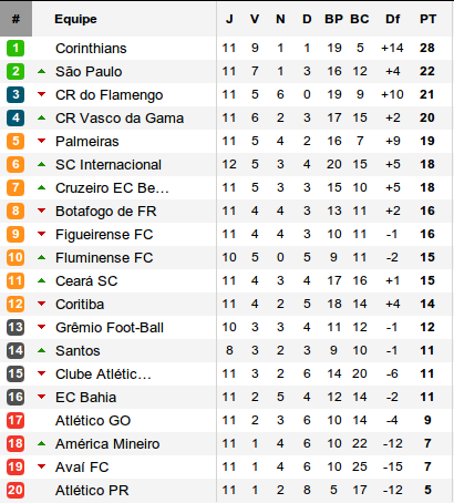 Il aura fallu attendre la 11e journée et un coup de génie de Wallyson pour voir les Corinthians tomber. En inscrivant le seul but de la rencontre au sommet de la 11e journée, Wallyson a non seulement relancé Cruzeiro mais surtout évité que les Corinthians creusent encore plus l'écart avec la meute de poursuivants. Car derrière, le Flamengo de Ronaldinho concédait le nul chez lui face à Ceará et São Paulo s'en remettait à l'éternel Rivaldo pour sauver le résultat nul chez lui devant le modeste Atlético Goianiense alors que Palmeiras s'inclinait sur le terrain de Fluminense.