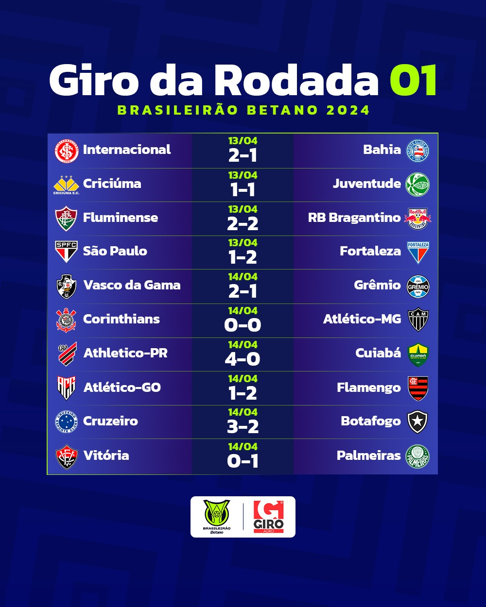 Alors que le Corinthians et l’Atlético Mineiro se quittent sur un score nul et vierge à l’Arena Corinthians, Vasco réussit sa soirée placée sous le signe des hommages à l’idole Roberto Dinamite, décédé en janvier 2023 et qui aurait fêté ce samedi ses soixante-dix ans. Même sans Dimitri Payet, victime d’une entorse au genou, Vasco s’impose 2-1 contre Grêmio et débute bien ce Brasileirão. Le premier leader du championnat est cependant l’Athletico Paranaense, qui écrase Cuiabá sur le score de 4-0.