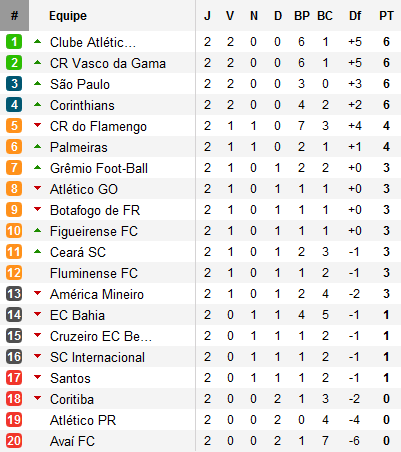 Dans son retard, Santos n'est pas seul. Avec lui, Cruzeiro et l'Internacional, battu chez lui par Ceará pour ce qui reste la surprise du week-end, restent ancrés en queue de classement juste devant trois équipes à zéro point : Avaí, l'Atlético Paranaense et celui qu'on annonçait comme un outsider possible, Coritiba, finaliste de la Coupe du Brésil.