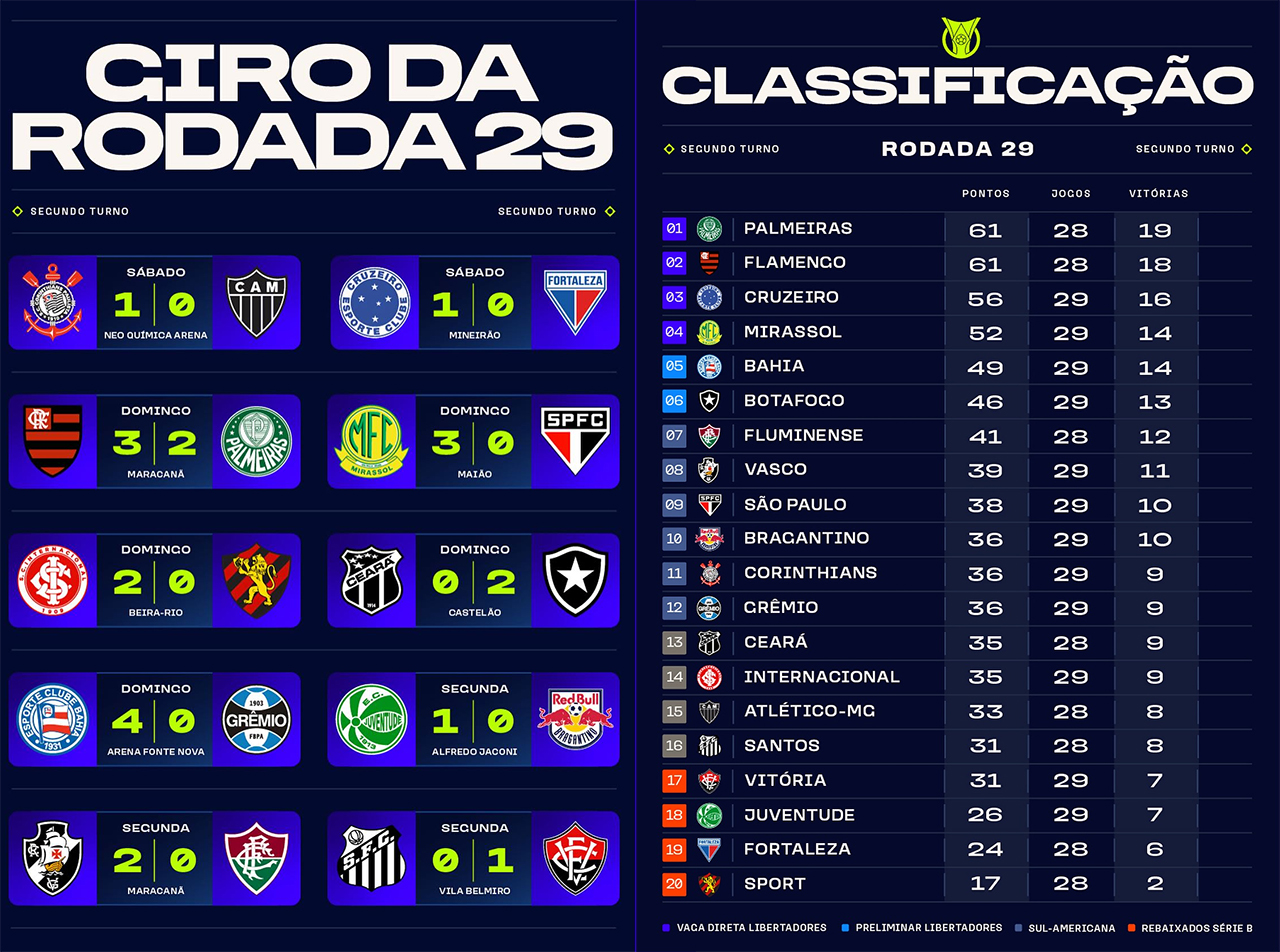 En ouverture de la vingt-neuvième journée, le Corinthians affronte l’Atlético Mineiro à l’Arena Corinthians. Grâce à son trio Rodrigo Garro – Memphis Depay – Yuri Alberto, titularisé pour la première fois de la saison dans le Brasileirão, et un golaço de Maycon, le Corinthians s’impose 1-0 et se rapproche de la première partie de tableau. Victoire aussi sur la plus petite des marges pour Cruzeiro, qui restait sur quatre matchs sans victoire et conserve des chances infimes de remporter le championnat.