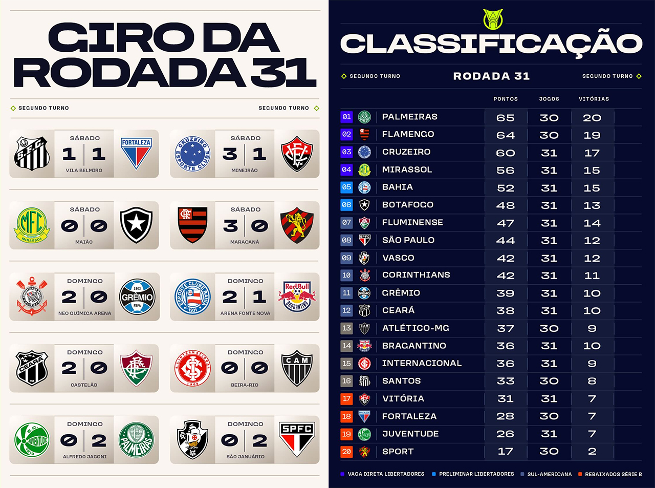En ouverture de la vingt-neuvième journée, Cruzeiro reçoit le relégable Vitória pour conserver une chance infime d’être champion. Mission accomplie pour la Raposa, l’artilheiro du championnat Kaio Jorge s’offrant un doublé. Avec soixante points en trente-et-un matchs, Cruzeiro maintient un rythme de champion, mais Palmeiras et Flamengo font encore mieux…