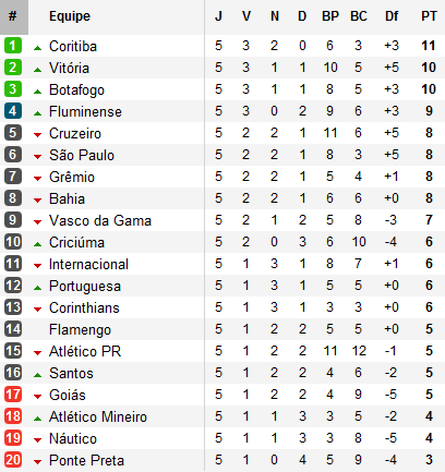 Comme souvent, le championnat brésilien laisse d’abord la place aux surprises. Emmené par Deivid, Coritiba plane sur les cinq premières journées, seule équipe encore invaincue. Dans sa roue, le promu Vitória, porté par le buteur Maximiliano Biancucchi, s’accroche, précédent quelques outsiders et favoris. Seuls manquent à l’appel l’Atlético Mineiro, sans doute concentré sur la Libertadores, et Santos, qui attend la cinquième journée pour enfin connaître la victoire.