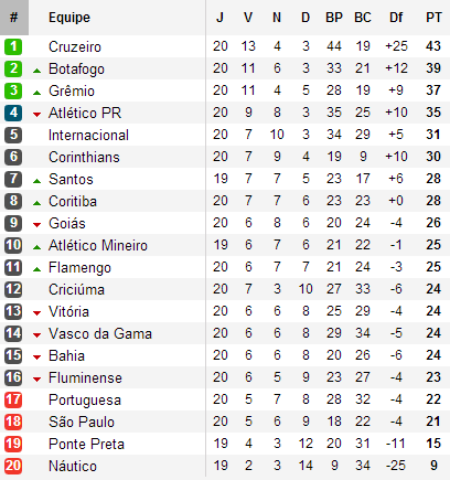En déplacement à la Serra Dourada, Cruzeiro s’en remet à Willian pour prendre le dessus sur Goiás et ainsi conserver sa première place ainsi que l’écart qui le sépare de ses poursuivants. Cet écart aurait même pu s’accroître si Hyuri n’avait pas réussi à sauver le Fogão au Maracaña face au Corinthians. Derrière, Grêmio assure en déplacement en s’imposant sur le terrain du Náutico. Conséquence, c’est le status quo en tête : Cruzeiro conserve quatre points d’avance sur Botafogo, six sur Grêmio.